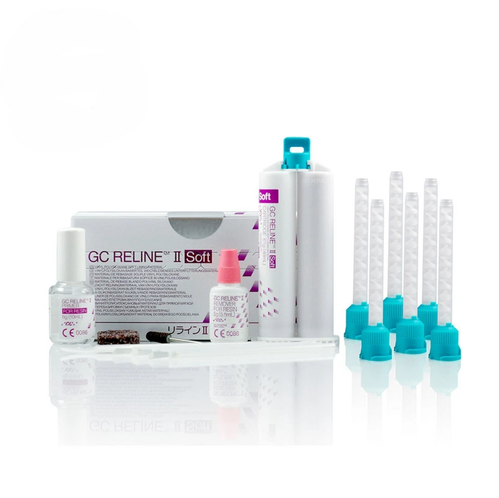 GC RELINE™ II may be used with resin and metal-based dentures, and when applied as directed with the accompanying Primer. The GC RELINE™ II Introductory Kit includes one liner material cartridge, primer, remover, trimming point, finishing wheel, mixing tips, plastic spatula, disposable brushes and a technical guide. This product is available in Soft, Extra Soft, and Extra Extra Soft versions; individual refills for each kit are available.